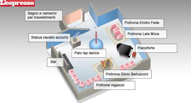 Andiamo con ordine. C frequenta i locali che contano per farsi notare: “A Milano ci sono dei locali frequentati abitualmente da quel giro”, racconta, “ristoranti come Giannino e Il Bolognese, club come l’Hollywood e il Just Cavalli”. Una sera, racconta, un imprenditore del settore auto di lusso le dice: “Ti faccio conoscere lui”. Lei non ci crede finché non succede davvero. Dopo la cena, condita da regali, si scende nella sala. Sulla destra – dice l’Espresso – c’è la statua di un cavallo azzurro a grandezza naturale, posizionata vicino al bancone del bar. Una porta laterale si apre verso la piscina. Al centro del locale è piantato il palo da lap dance, intorno ci sono le poltrone e un pianoforte. “Sul lato sinistro – dice C – erano seduti Lele Mora ed Emilio Fede, Berlusconi stava di fronte al palo, su una poltrona bianco panna”. Poi comincia il divertimento: “Vestite da poliziotte e infermiere sexy ballavano, si toccavano, si baciavano e di tanto in tanto si avvicinavano a Berlusconi. Che a sua volta le toccava e le baciava senza dire nulla, come per testarle”. Dopo un po’ C ne avrà abbastanza “vista la piega” da tornarsene a casa. Non così, dicono le carte, la penseranno altre ragazze.